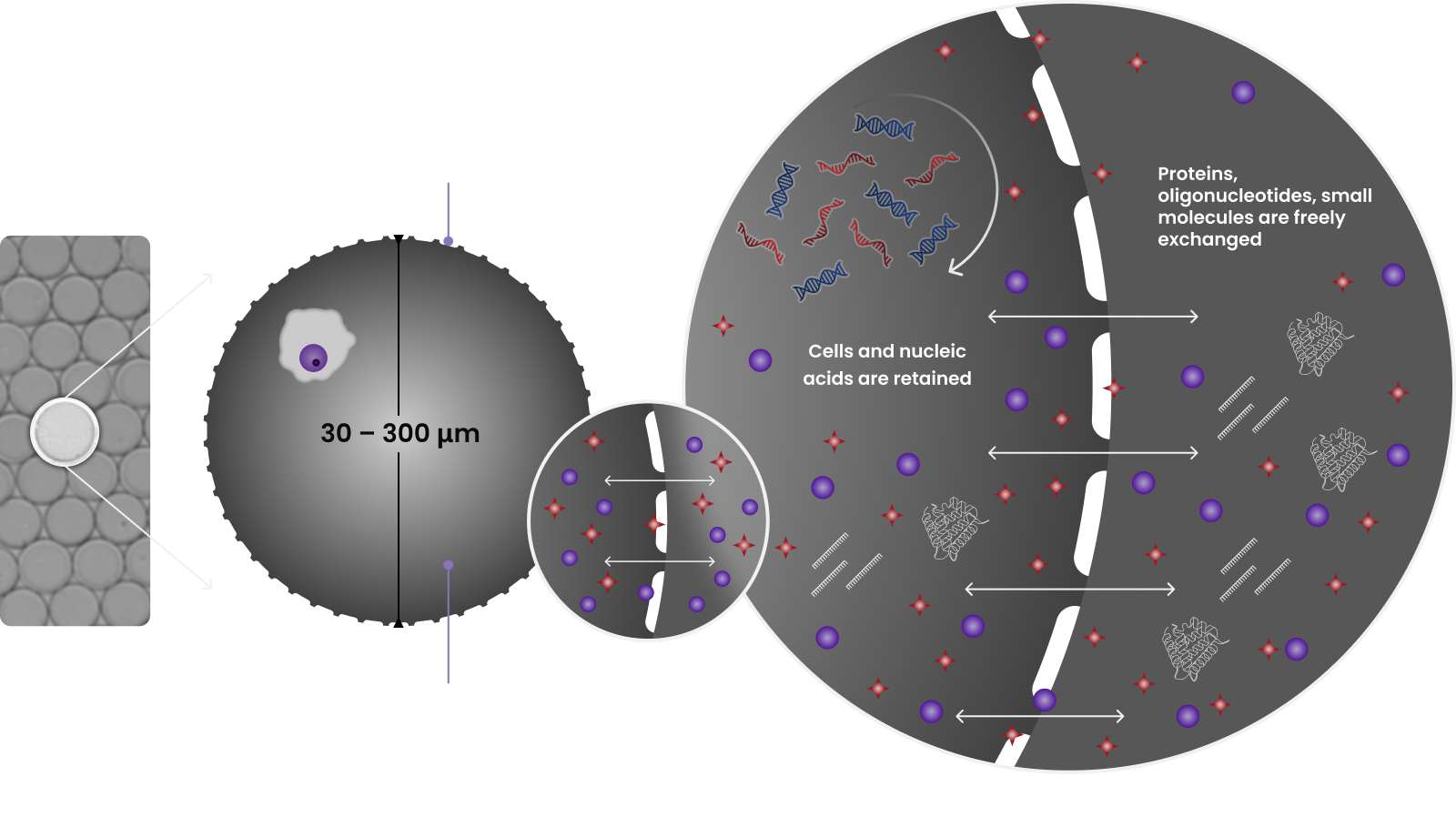 Semi-Permeable Capsules have an aqueous core and sieve-like walls that keep the cells and nucleic acids partitioned inside, while allowing the free flow of the surrounding solution, be it molecular biology reagents, buffers or media.
